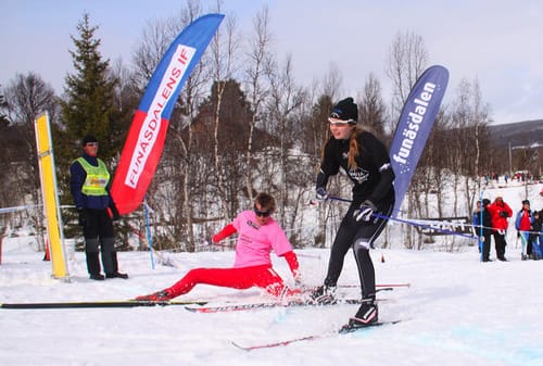 Knallcrossen i Bruksvallarna är tävlingen där alla kan nå fram och få möta världsstjärnorna. På bilden ser du den trefaldige världsmästaren av året, Petter Northug från Norge, få sträcka sig till det yttersta för att besegra 14-åriga Hedda Bångman från Offerdal i kampen om andraplatsen…