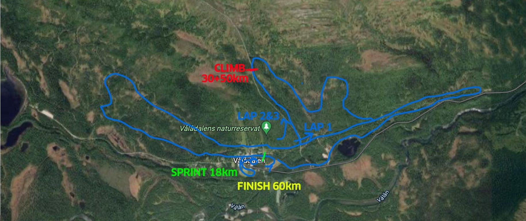 Loppet blir nu 62 kilometer på tre varv enligt kartan nedan: