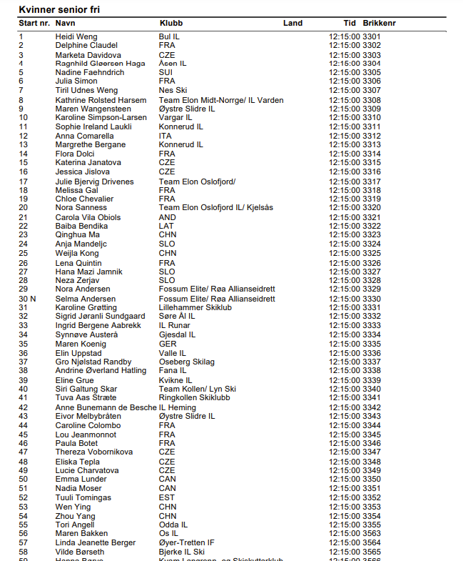 Här är damernas startlista i sin helhet: