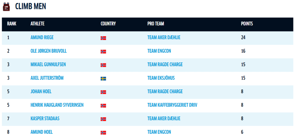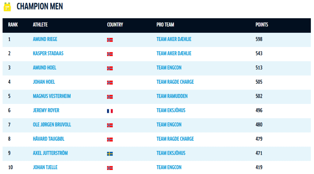 I herrklassen är det lagkamraterna i Team Aker Dählie som ligger etta och tvåa. Amund Riege leder och har 55 poäng ner till Kasper Stadaas på andraplatsen. Amund Hoel från Team Engcon är trea, 85 poäng från Riege.
