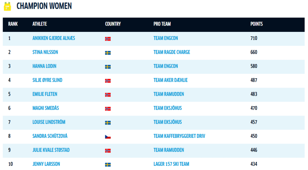 Efter La Diagonela har det skett några förändringar i kampen om de olika västarna. I damklassen är fortsatt Anikken Gjerde Alnes i ledning. Hon har 50 poäng ner till Stina Nilsson som ligger tvåa och 130 poäng ner till Hanna Lodin på tredjeplatsen.