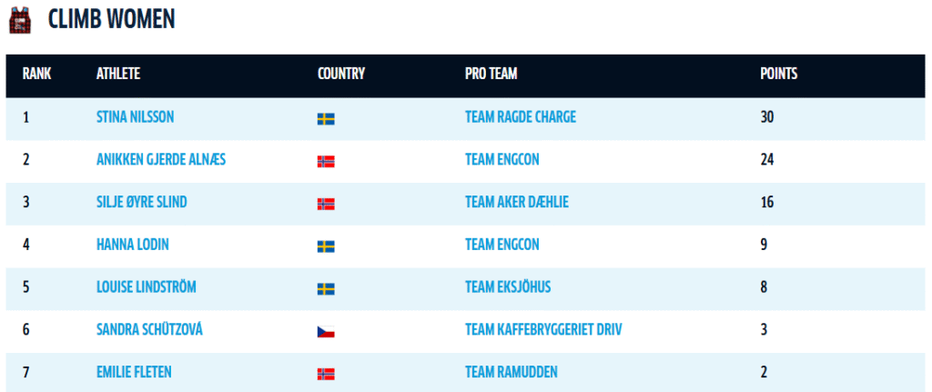 Det delades inte ut några climb-poäng under helgens Engadin La Diagonela. Stina Nilsson och Amund Riege bär därför båda den rutiga tröjan inför helgens Marcialonga. Stina Nilsson har en ledning på sex poäng ner till jagande Anikken Gjerde Alnes. Amund Riege leder med åtta poäng före Ole Jörgen Bruvoll.