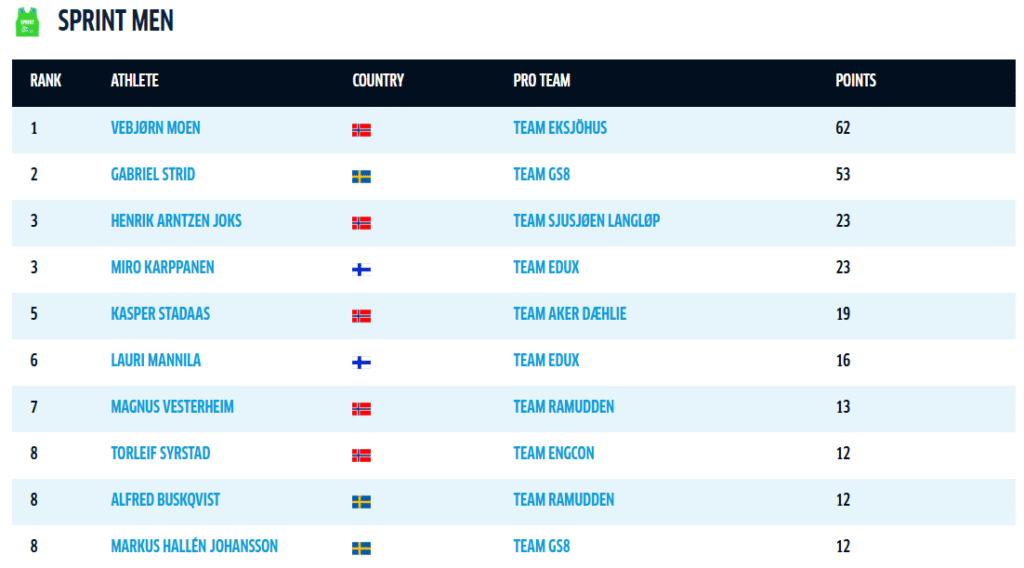 Vebjörn Moen har ledningen i kampen om sprinttävlingen, men endast med nio poäng ner till Gabriel Strid. Henrik Arntzen Joks från Team Sjusjøen Langløp ligger trea på 23 inkörda poäng.