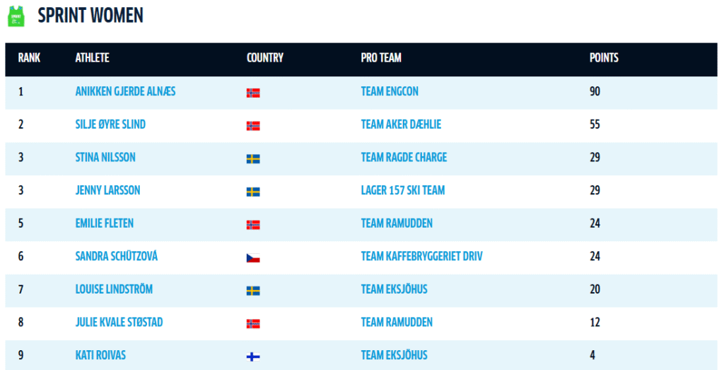 Anikken Gjerde Alnes är i topp även i kampen om den gröna sprinttröjan. Hon har 35 poäng ner till Silje Öyre Slind som ligger tvåa. Stina Nilsson är på tredjeplatsen, 61 poäng från ledning.