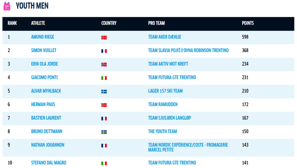 Amund Riege är i ledning i nästan alla tröjor. I ungdomstävlingen har han en ledning på 230 poäng före Simon Vuillet från Team Slavia Pojišťovna Robinson Trentino. Erik Ola Jorde från Team Aktiv Mot Kreft, ligger trea.