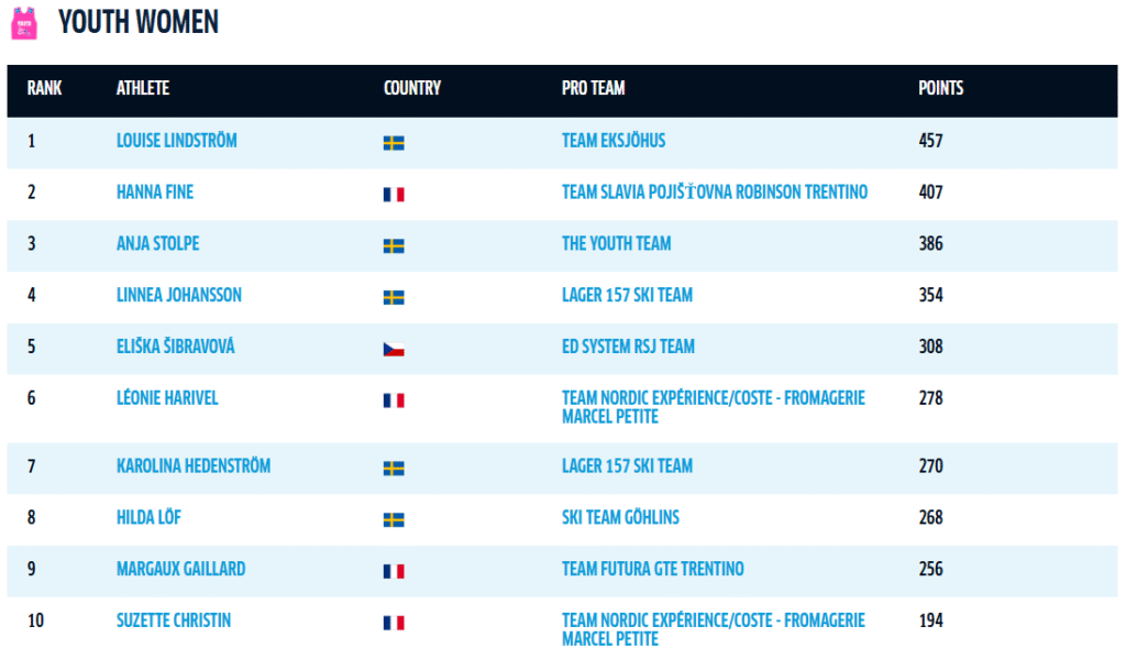 Louise Lindström har kopplat ett grepp om den rosa ungdomströjan 50 poäng före Hanna Fine från Team Slavia Pojišťovna Robinson Trentino. Anja Stolpe från The Youth Team ligger på en tredje plats.