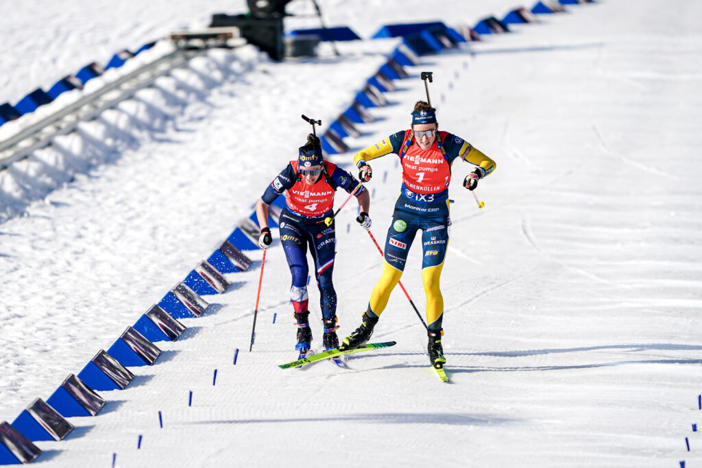 Anna Magnusson skjuter fullt och plockar någon placering; nu är hon 20 sekunder efter på en sjätteplats. Ella Halvarsson får också till skyttet men har lite längre upp, en minut för att vara exakt. Linn Gestblom kom undan med en bom, och Anna-Karin Heijdenberg bommade två.