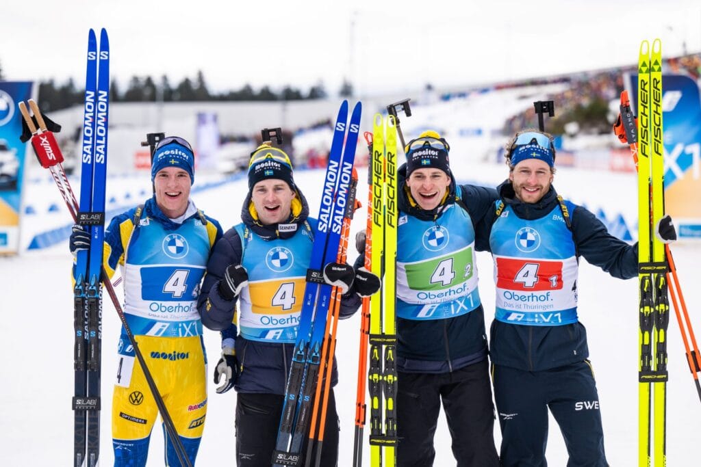 Guldet gick till det franska laget som spolierade Johannes Thingnes Bös chanser att nå det uttalade målet om sju guld i Oberhof. För Sverige blev den andra och tredje sträckan nycklar i jakten på bronsmedaljen, där Jesper Nelin och Martin Ponsiluoma klarade sig med ynka ett extraskott var i det stående skyttet.