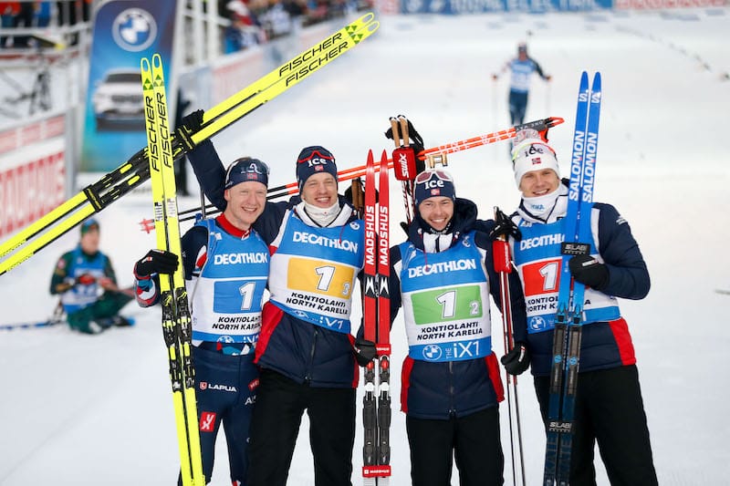 Efter Tarjei Bös andra sträcka hade Norge kopplat greppet om stafetten. När han växlade ut lillebror Johannes Thingnes Bö hade man en ledning på 10 sekunder. Thingnes Bö förvaltade ledningen bra och vid växling hade han 30 sekunder till godo på Emilien Jacqueline. Vetle Sjåstad Christiansen höll undan för Frankrike på sista sträckan och körde hem segern. Frankrike slutade tvåa och Tyskland höll trots en straffrunda i sista skyttet, undan och slutade trea.